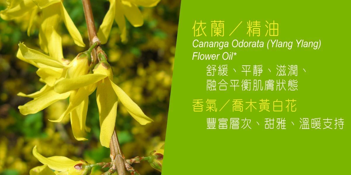 燕麥油*、向日葵油*、玫瑰純露*、荷荷芭油*、蘿蔔根萃取、洋甘菊純露、蓮藕根萃取、精米萃取*、石榴萃取*、超氧化物岐化酶(SOD)、大豆精萃、海百合萃取、褐藻萃取、玻尿酸、雪松精油*、檀香精油*、依蘭精油*、玄米油