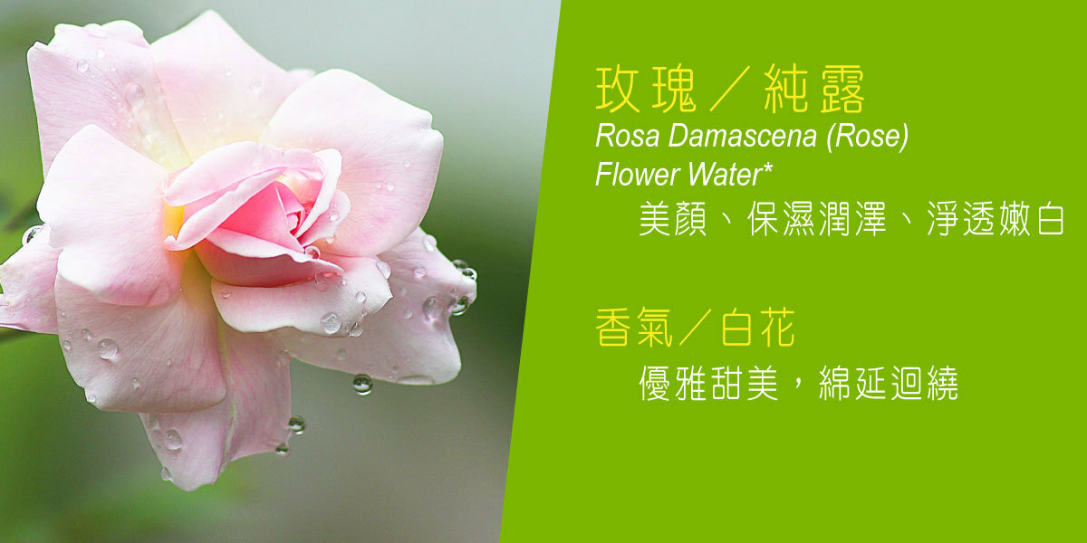 特色原料:玫瑰純露*、洋甘菊純露、石榴萃取*、超氧化物岐化酶(SOD)、海百合萃取、褐藻萃取、玻尿酸、雪松精油*、檀香精油*、依蘭精油*(*:有機來源,天然來源總比例 :100﹪,總有機比例 :40﹪)