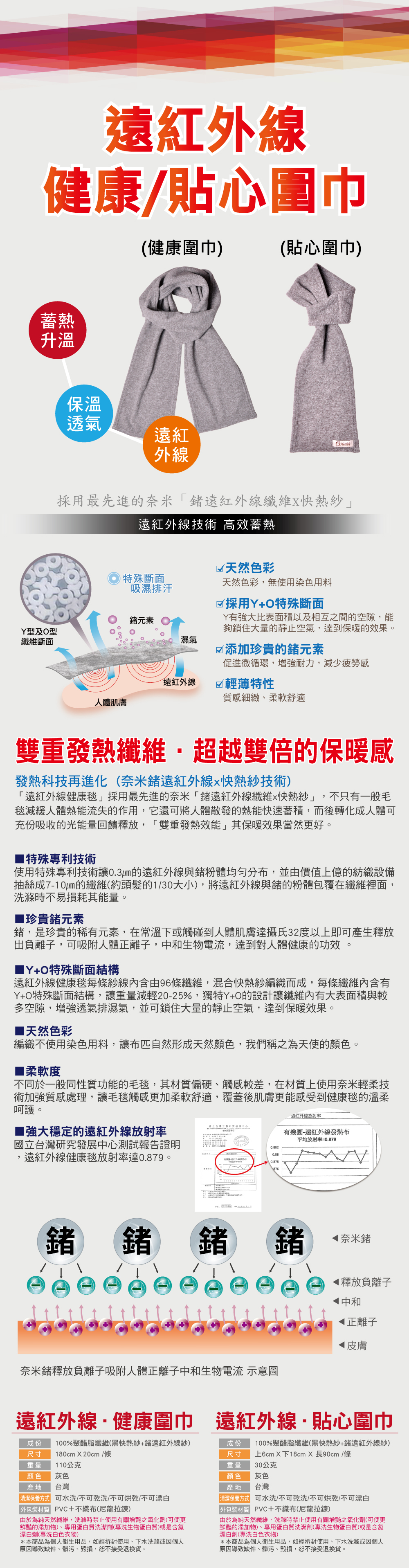 發熱科技再進化 (奈米鍺遠紅外線x快熱紗技術) 「遠紅外線健康圍巾」採用最先進的奈米「鍺遠紅外線纖維x快熱紗」,不只有一般圍巾減緩人體熱能流失的作用,它還可將人體散發的熱能快速蓄積,而後轉化成人體可充份吸收的光能量回饋釋放,「雙重發熱效能」其保暖效果當然更好。