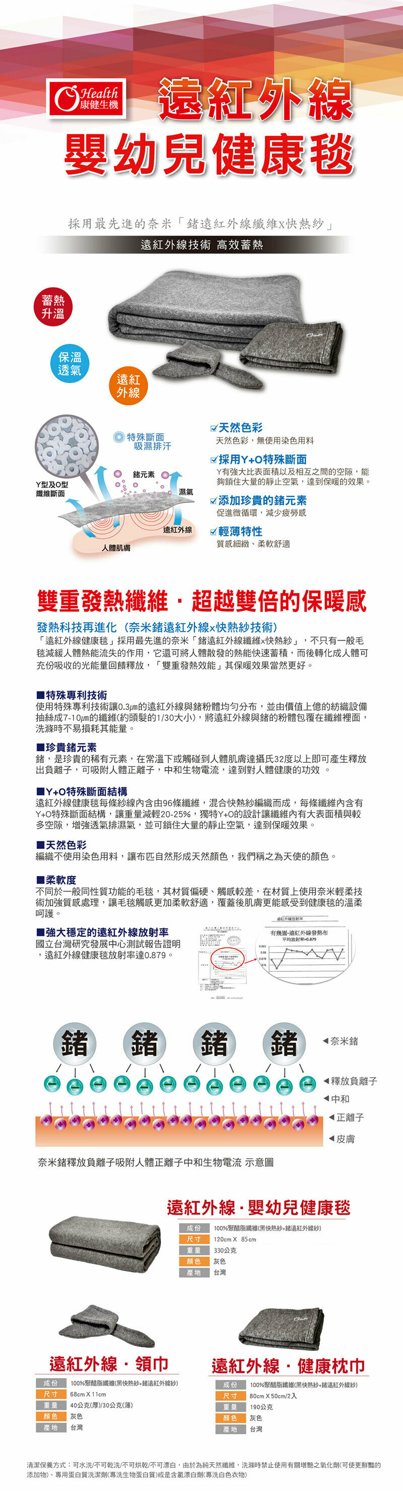 發熱科技再進化 (奈米鍺遠紅外線x快熱紗技術) 「遠紅外線嬰幼兒健康毯」採用最先進的奈米「鍺遠紅外線纖維x快熱紗」,不只有一般毯子減緩人體熱能流失的作用,它還可將人體散發的熱能快速蓄積,而後轉化成人體可充份吸收的光能量回饋釋放,「雙重發熱效能」其保暖效果當然更好!