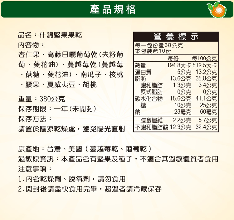 內容物:杏仁果、葡萄乾、蔓越莓乾、南瓜子、核桃、腰果、夏威夷豆、胡桃